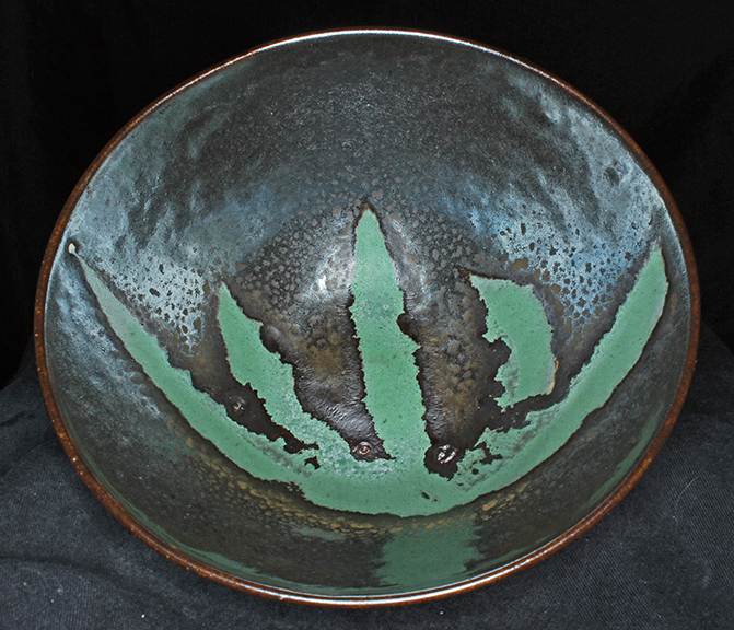 Note the irregular boundary between the two glazes, the cutouts in the inlay