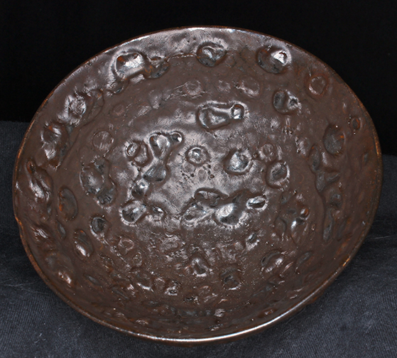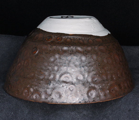 in the two states, volcanic mess on the inside of the bowl, and dull silvery ground with dimpled matt oil spots.